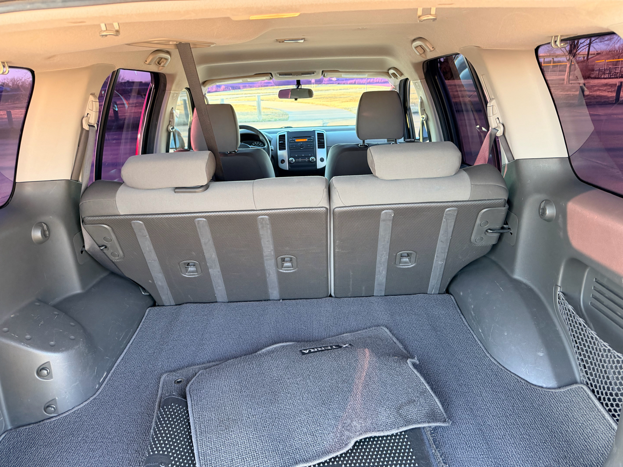 On the outside, this Xterra is equipped to handle whatever the road throws at it. The roof rack rails with crossbars and gear basket provide plenty of storage options for all your gear, while the tubular step rails make it easy to access the cabin. The dark gray front and rear bumpers, fog lamps, and privacy glass give this SUV a rugged and adventurous look that's sure to turn heads wherever you go.